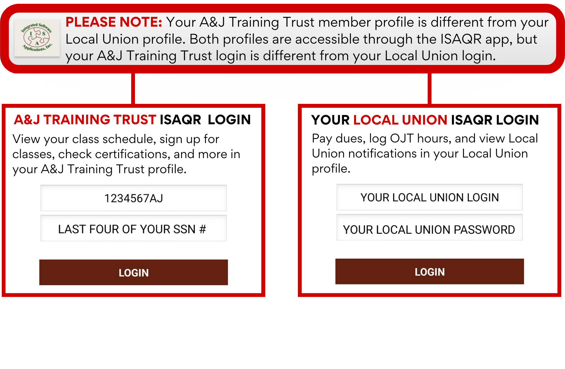 Your A&J Training Trust member profile is different from your Local Union profile. Both profiles are accessible through the ISAQR app, but your A&J Training Trust login is different from your Local Union login.